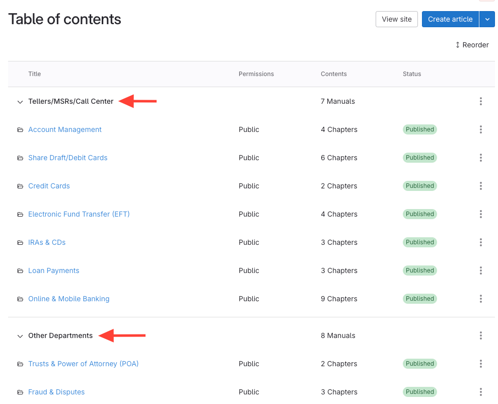 In the content management area, categories can be collapsed or expanded to show or hide the manuals they contain.