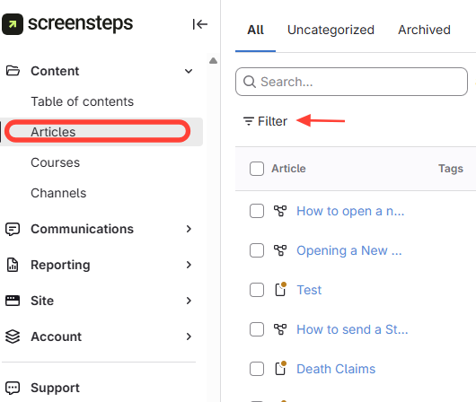 - Navigate to All Articles > Click Filter