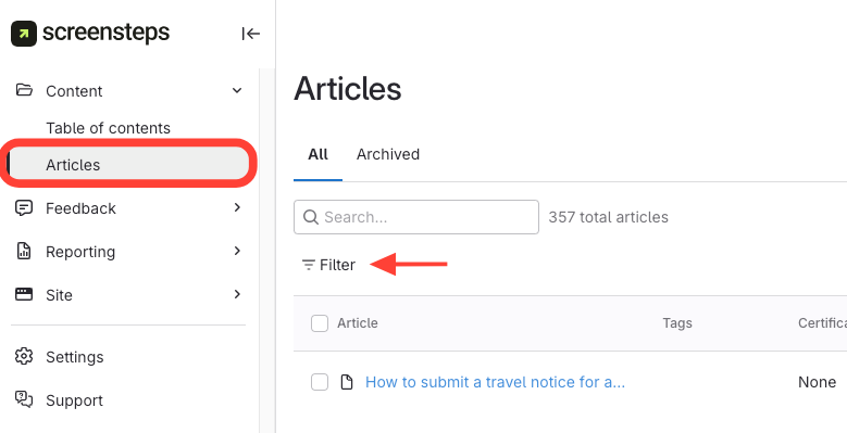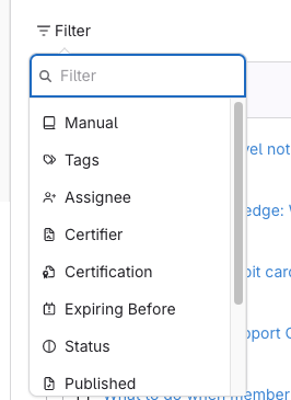 Filter Options Description Manual Use this filter to view all articles within a particular manual. Tags Use this filter to view all articles that have a specific tag assigned to it. Assignee Use this filter to view all articles assigned to a specific individual. Certifier Use this filter to view all articles that have a specific individual assigned as the certifier. Certification Use this filter to view all articles that have been marked as requiring certification. Expiring Before Use this filter to view all articles that require certification and view when they expire. Status Use this filter to view all articles that have a specific status. Published Use this filter to view all articles that have been published. Posted Use this filter to view all articles that have been posted between specific dates. Rating Use this filter to view articles that have been liked/disliked. Template Use this filter to view articles that are templates or not templates.