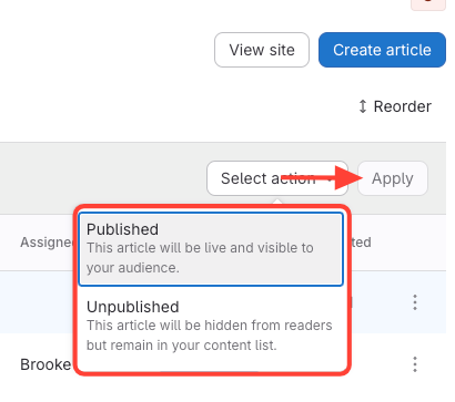 - Unpublished: The article will be hidden from those who can view the published site; however, it will still remain in the content list so those with editing permissions can review and update it.