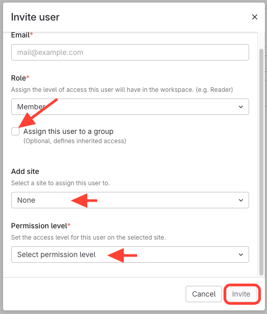 2. Uncheck Box > Select Site > Select Permission Level > Invite