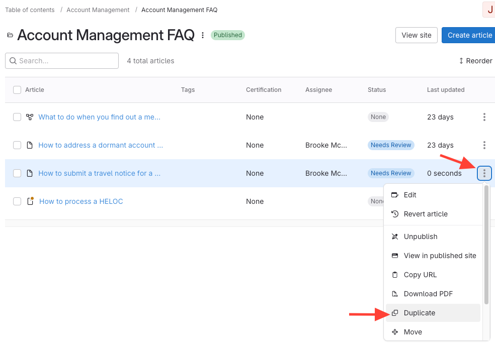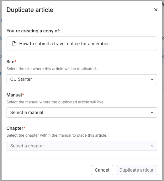 Note: This duplicate will be a completely separate version of the article. Making changes to one of the duplicated articles will not affect the original. If you want to have a the same article appear in multiple chapters, you will need to reference the article. Click here for instructions on how to do that: How to Reference an Article (i.e. make the same article appear in multiple chapters)