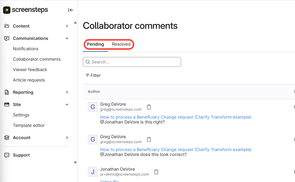 View Pending and Resolved Comments