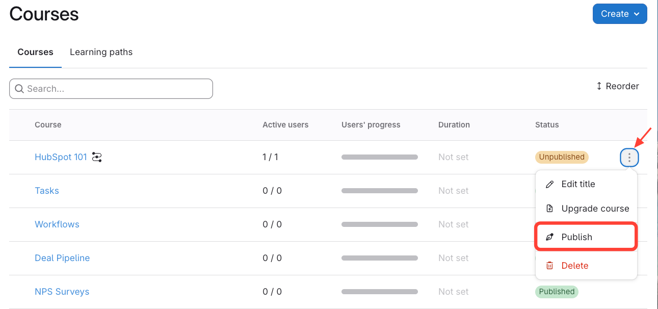 - Select Publish (this option will only show up if the course is unpublished).