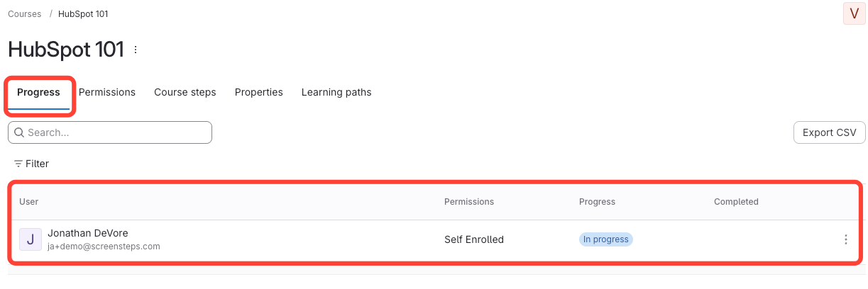 - View the list of courses, active users, and user progress.
