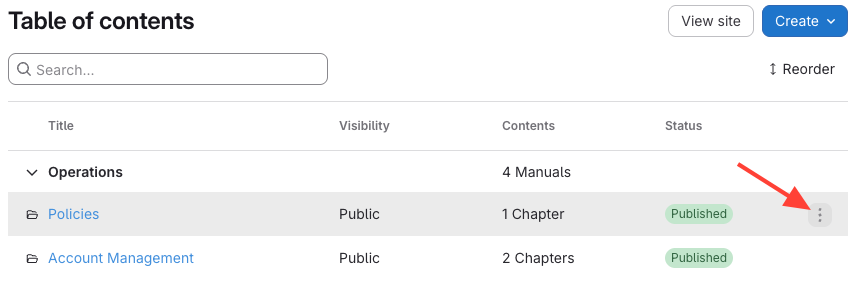 - Click the the manual, chapter, or article Action Menu