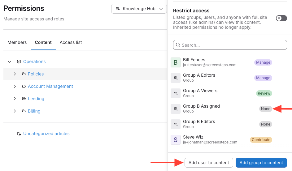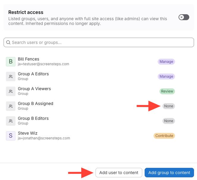- Add a user or group to the content.
