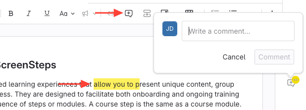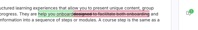When working on articles, suggestions function similarly to "track changes" in word processing software. Users can propose edits, which may then be accepted or rejected by others. Comments are a separate feature that allows users to leave feedback or notes on specific parts of an article.