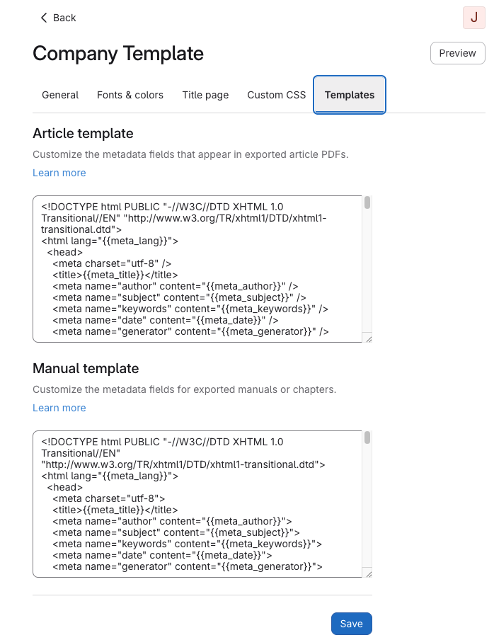 You will find the article and manual HTML in the Article Template and Manual Template tabs. Updating the HTML in either of these tabs will affect how your PDF output looks.