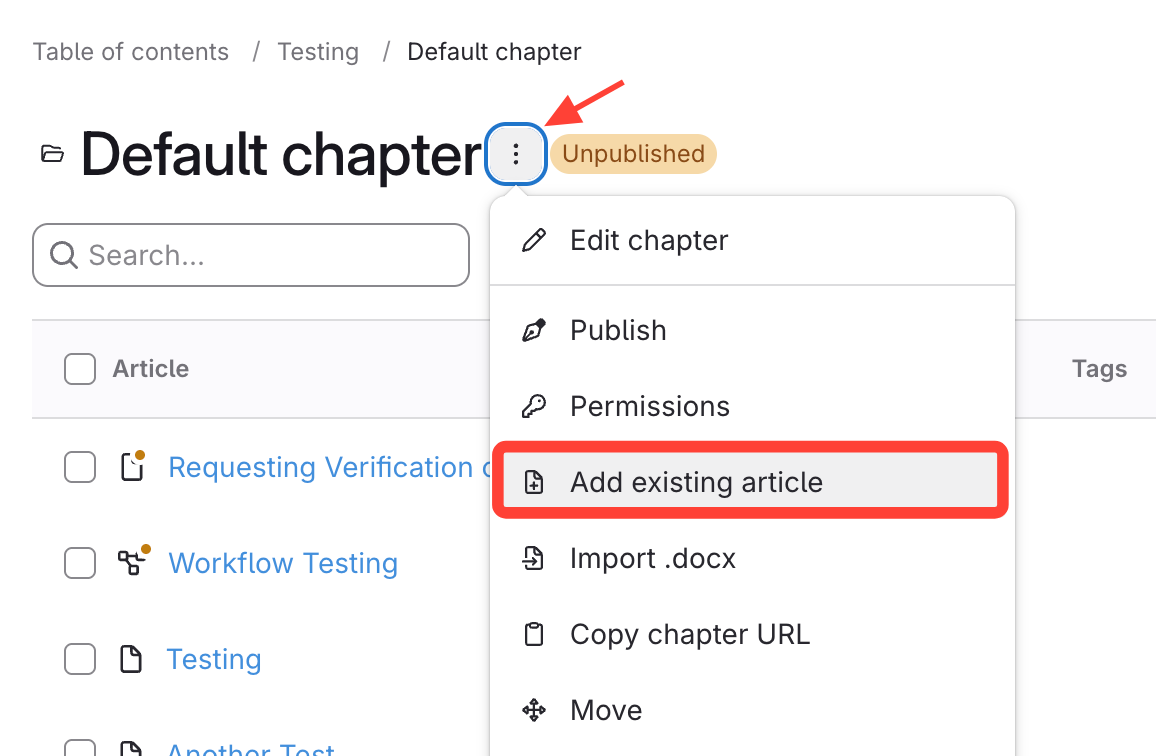 - Open the chapter action menu next to the new chapter.