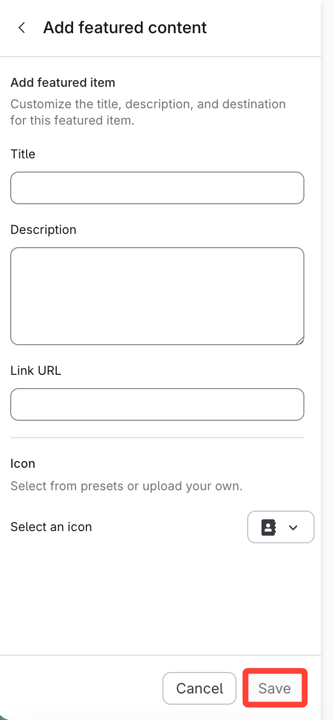 the title, description, link URL, and icon.