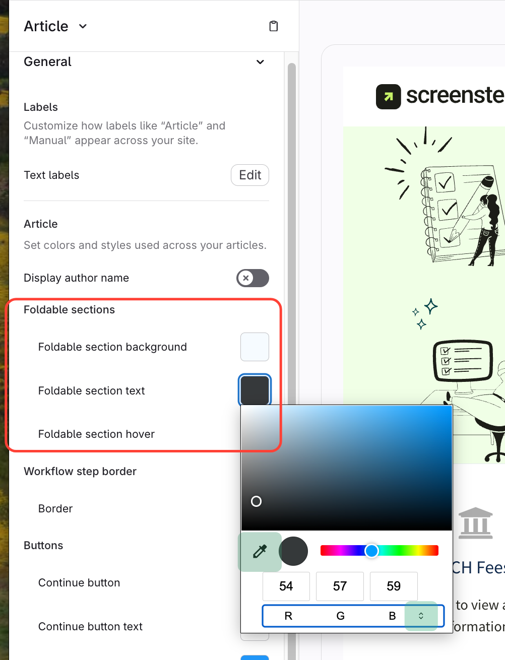 Select the desired color for Foldable section text/background/hover