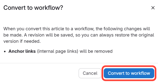 If your account includes support for workflows or regular articles hen you are given the option of creating a regular article, or a workflow whenever you create a new article. This article will show you how to change the article type after you have created the article.