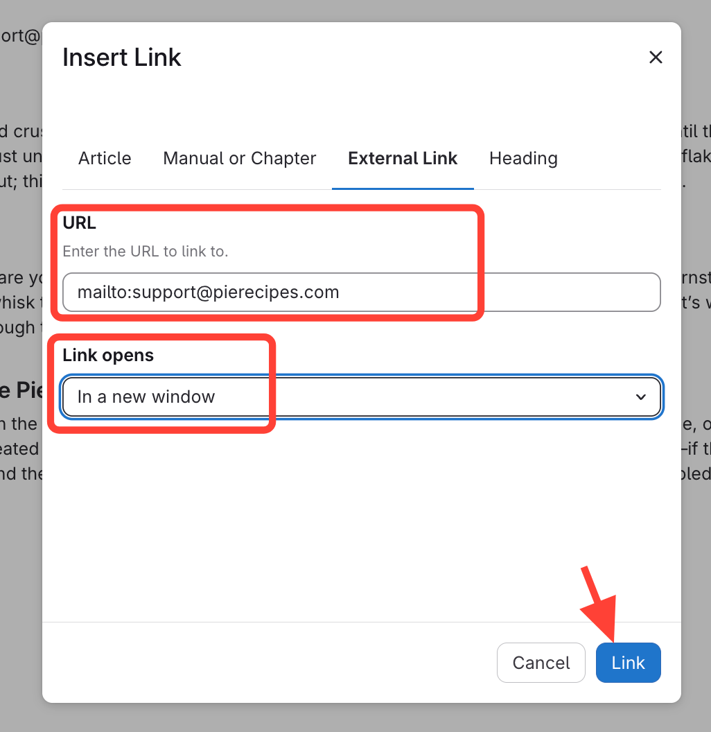 mailto:followed by the email address.Set link to open In a new window