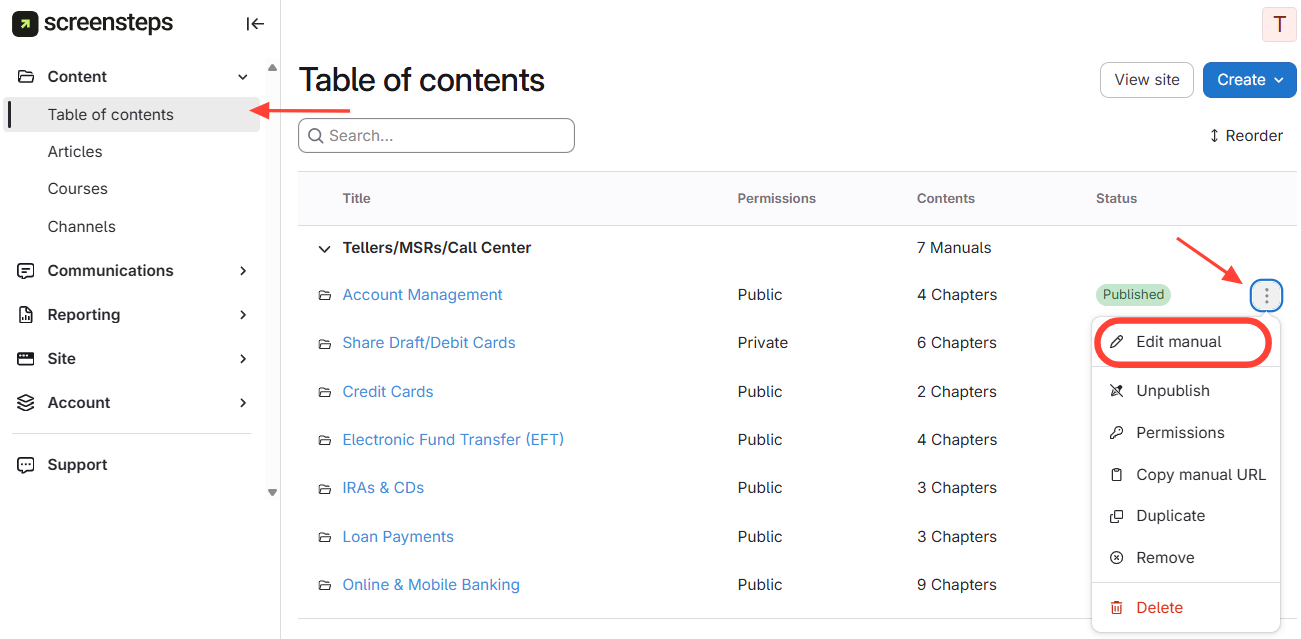 Edit Manual from the Table of Contents view