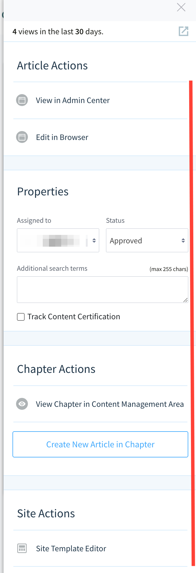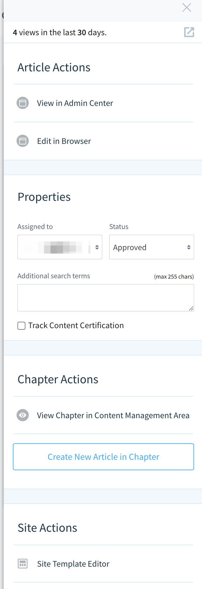 The Author Action Panel's options change depending on when it is clicked. For example, if you are viewing an article, then you will be able to edit the article, assign the article, add additional search terms, etc. Those options will not appear if you pull up the panel while viewing a manual.