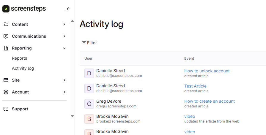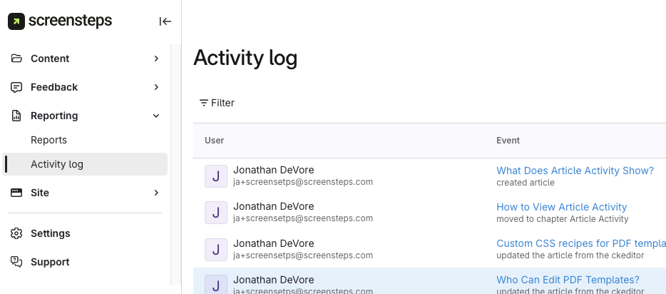 Article activity helps teams monitor important changes to content, ensuring accountability and transparency for published information. It is especially useful for tracking who made key updates and when those updates occurred.