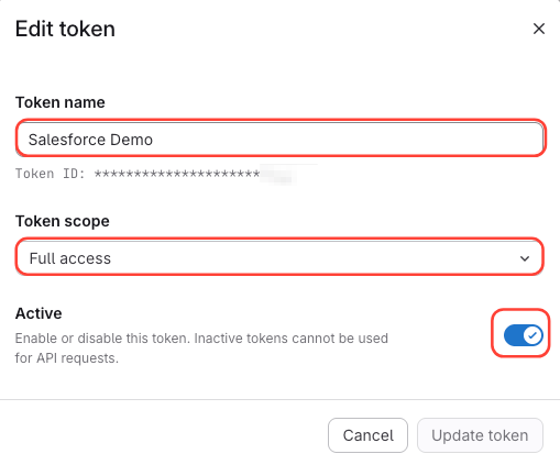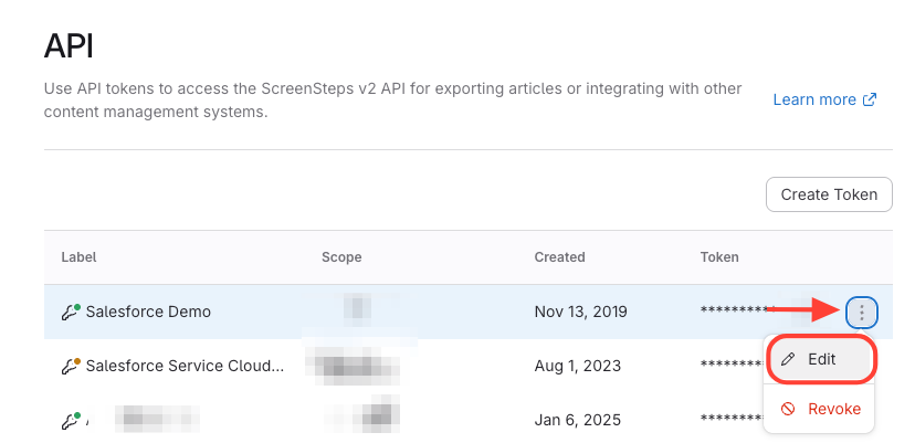 What you will accomplish: You will find your existing ScreenSteps API token and edit it. You can change the token's name, change the scope from Full Access to be specific to a site, or activate or deactivate (i.e. enable or disable) it.