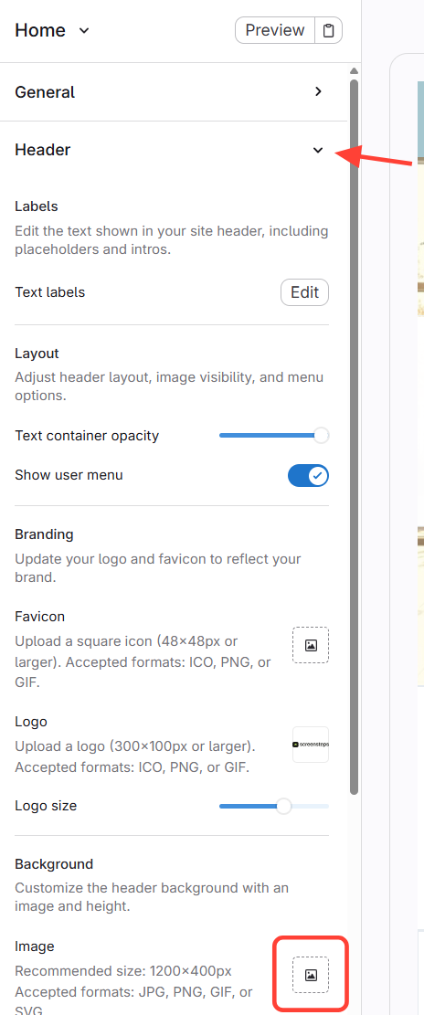 Scroll to the Header section. Select the image under Background