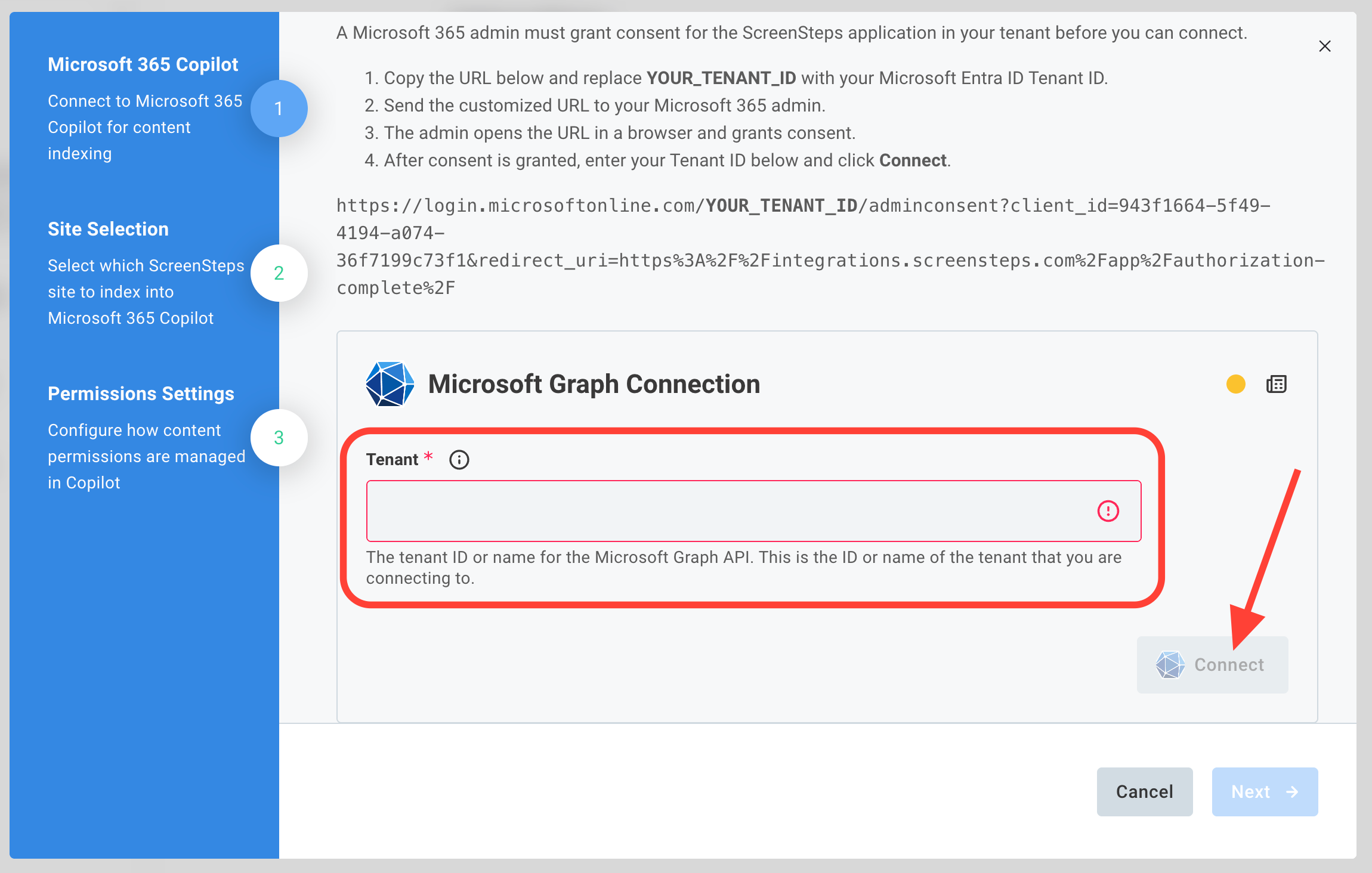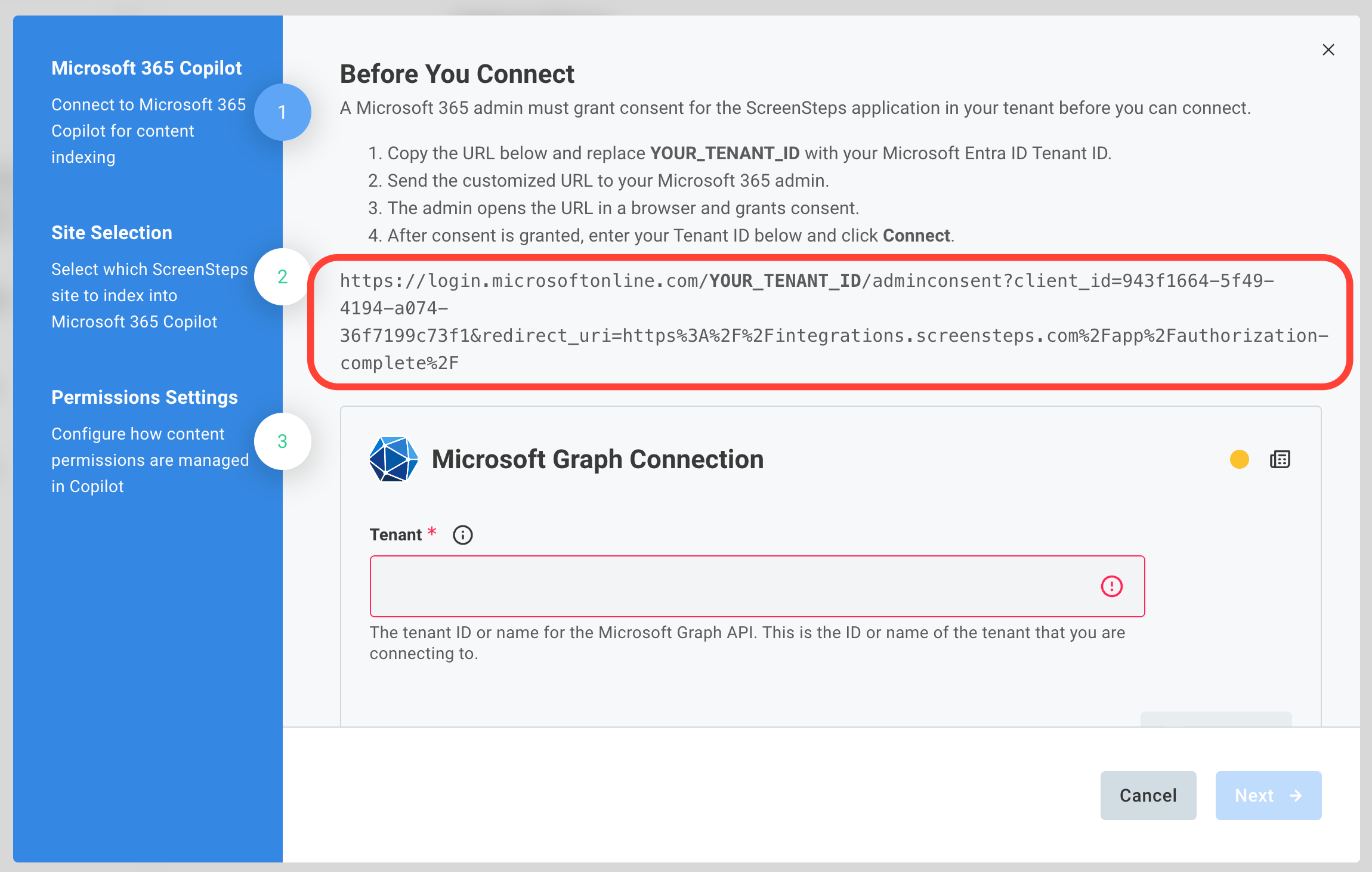The first step is to grant administrative consent to the ScreenSteps Copilot application in your tenant. Copy the URL containing YOUR_TENANT_ID, replace the placeholder with your tenant id, and paste it into a browser.
