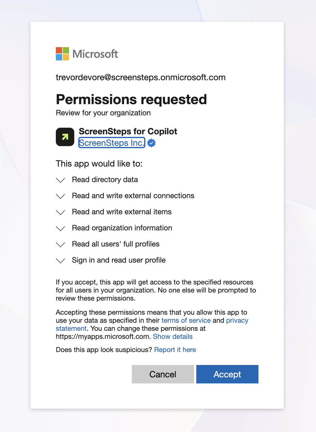 - Grant consent for the ScreenSteps application to your organization's Microsoft Entra ID Tenant
