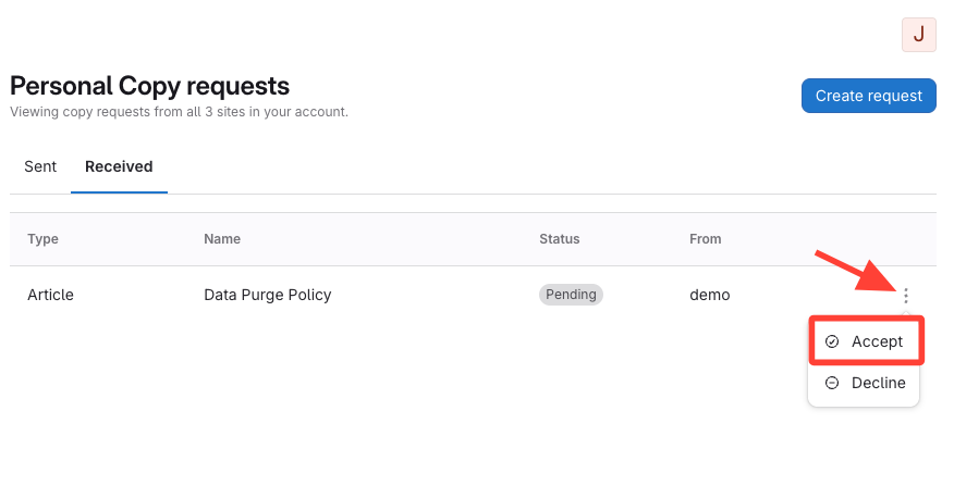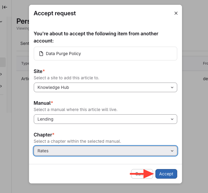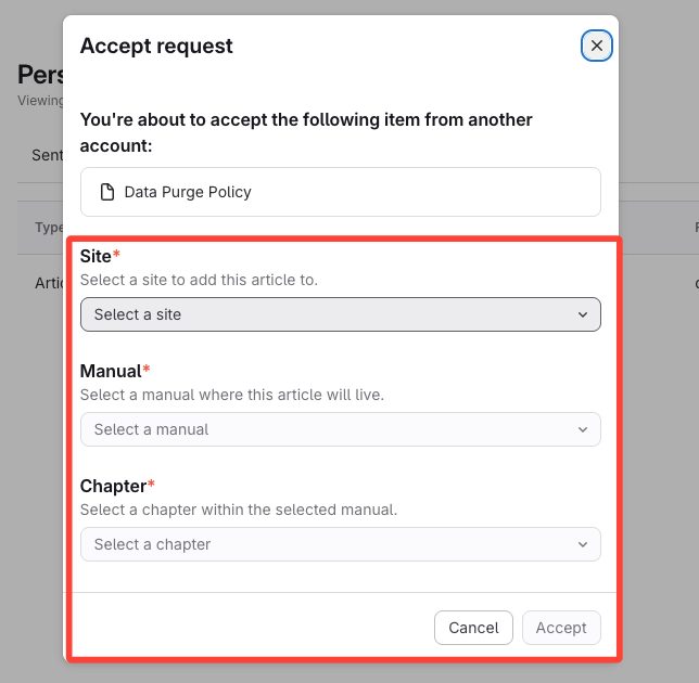If accepting, Select the site, manual, and chapter as required for the content type.